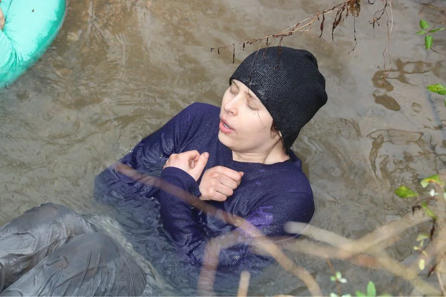 We started with just our feet and shins submerged in the creek. As we adjusted to the temperature, a refreshing 51 degrees, we slipped deeper into the creek until only our heads were above water. One by one, Herrington called on each person to think about the reasons they were taking the class and then dunk their head underwater.